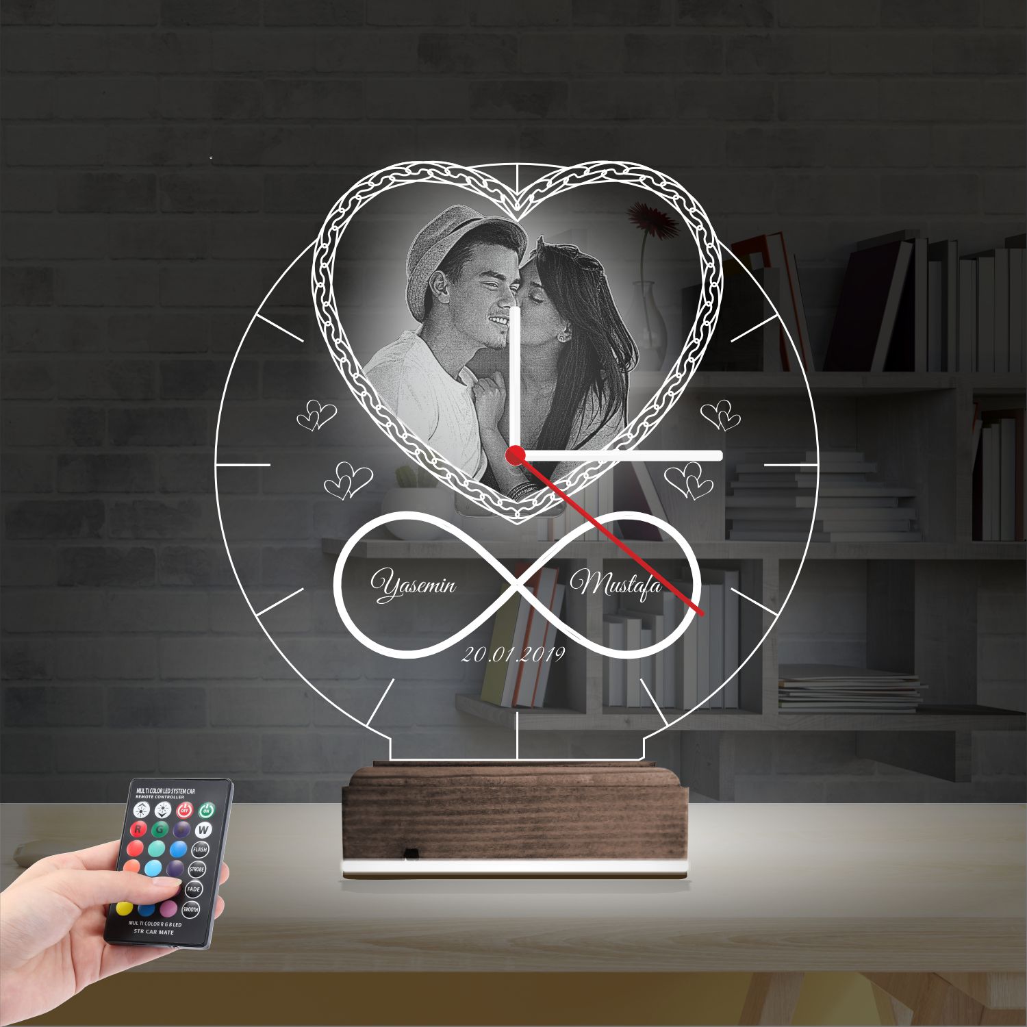 Мы объединили художественный объект с вашим фото и функциональные часы в одном устройстве. Этот современный светильник 3д со стильным циферблатом на корпусе самым эстетичным образом напомнит о каждой секунде вашей любви. Главная особенность изделия — его абсолютная уникальность. Помимо гравировки фото, вы можете добавить свои имена и дату самого счастливого дня внутрь знака бесконечности, создав единственный в мире именной подарок. Благодаря передовым технологиям, эти лед светильники долговечны, не нагреваются и создают идеальную романтическую атмосферу своим мягким светом. Для тех, кто ищет необычные подарки, этот светильник станет самым значимым выбором.